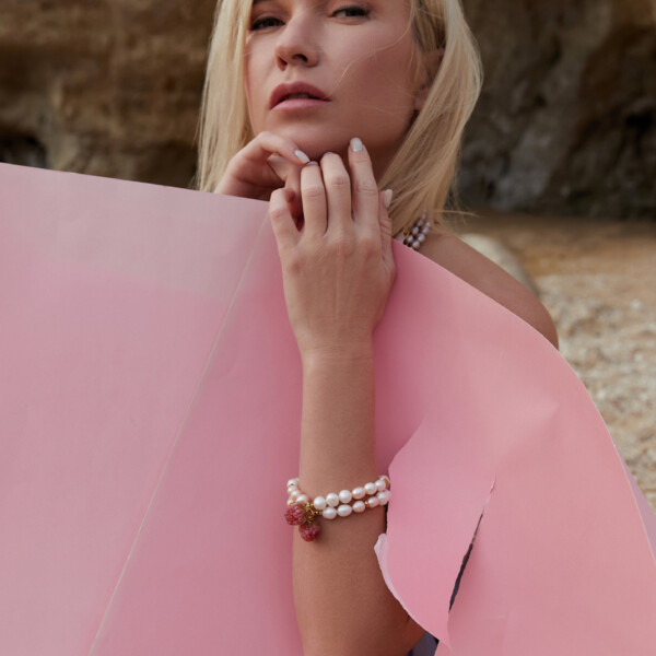 Natural pearls are in two shades: white and champagne. Rose and designer pouffes (beads) are made by hand of Italian (Murano) glass using the lampwork technique. Gold-tone fittings are made of hypoallergenic jewelry alloy.